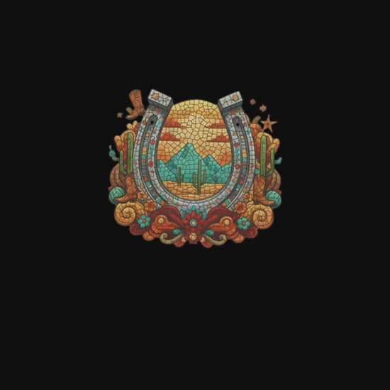 A mosaic-style horseshoe design inspired by the Western desert, featuring warm earth tones like terracotta, rust, turquoise, and sand. The rustic, handcrafted look gives it an authentic ranch vibe while symbolizing luck, prosperity, and protection.