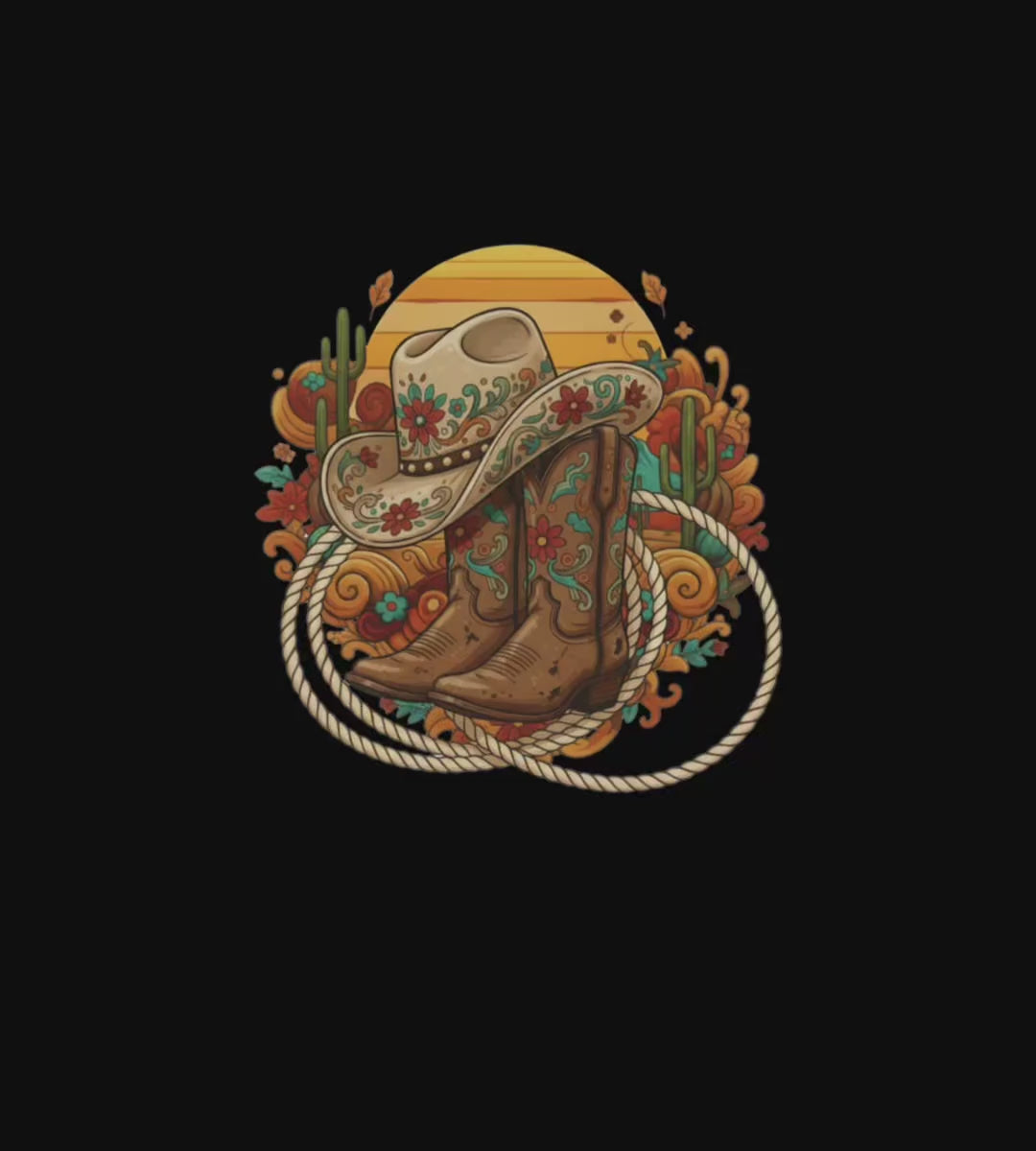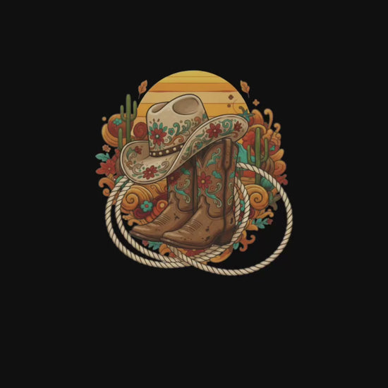 A vintage Western cowboy design featuring detailed floral-tooled boots, a patterned cowboy hat, rope lasso accents, and desert cacti set against a warm sunset backdrop. Rich tones of caramel brown, rust, burnt orange, mustard yellow, turquoise, and sage green create a bold desert-inspired palette. Perfect for Western apparel, boutique graphics, and rustic-themed prints.