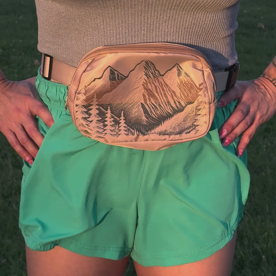 Stay organized, stylish, and adventure-ready with this unique beige fanny pack featuring mountains and forest trees in brown and bluesy gray.