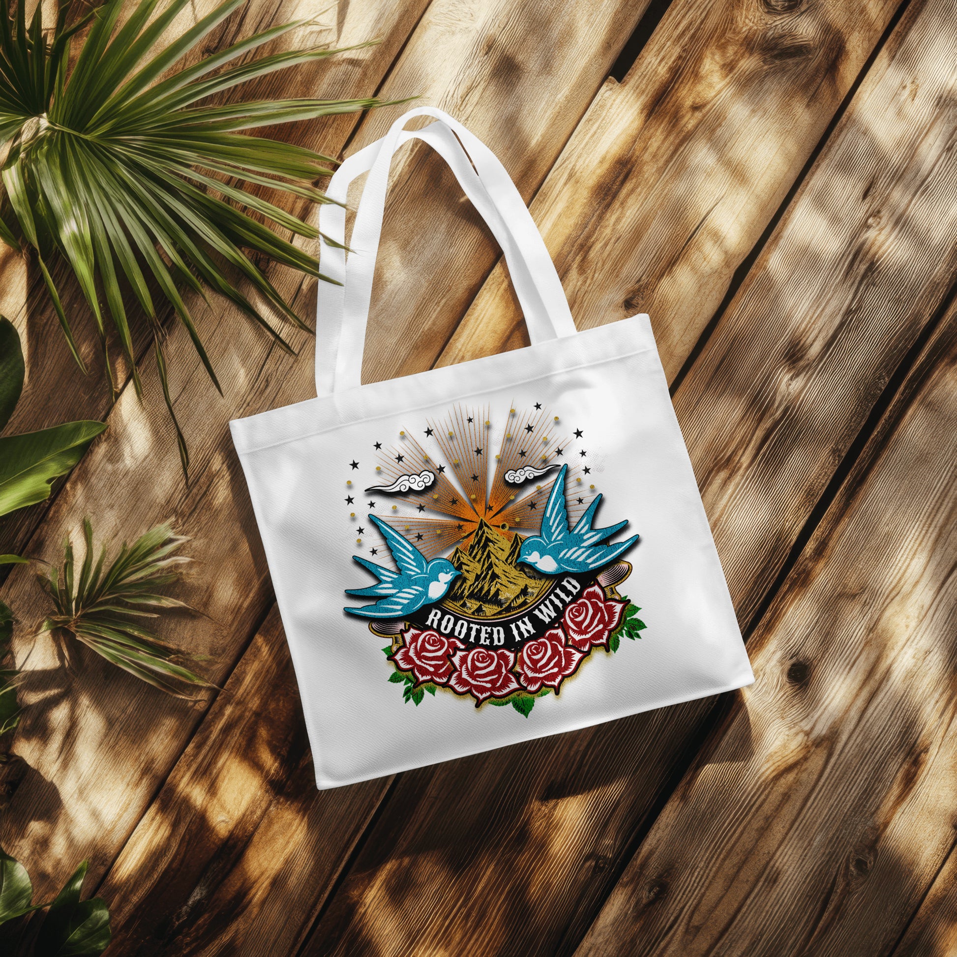 Featuring two swallows on each side holding a ribbon that reads “Rooted in Wild,” set against a backdrop of majestic mountains, a rising sun, and subtle star accents, this design captures strength, freedom, and a fearless connection to the wild.